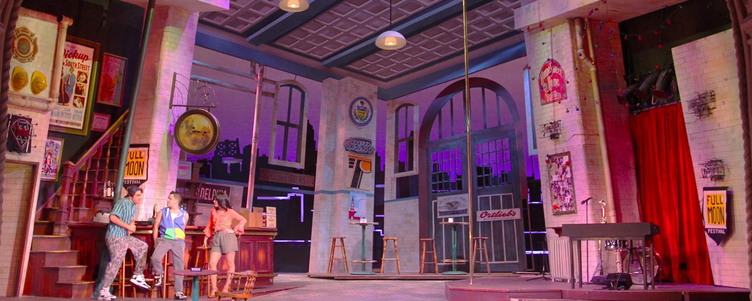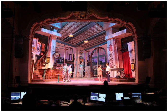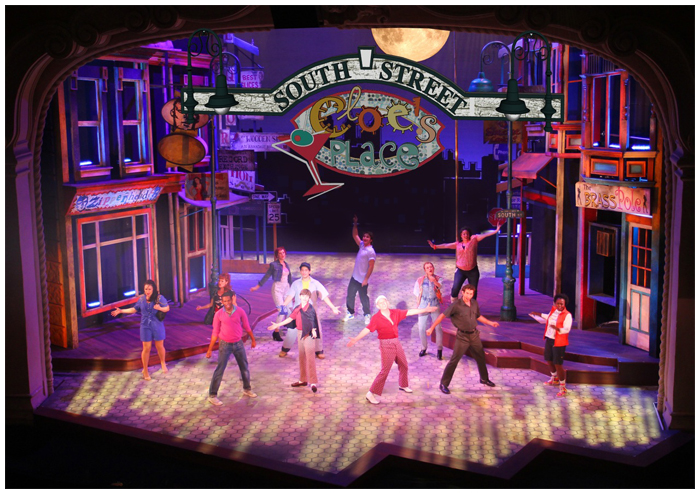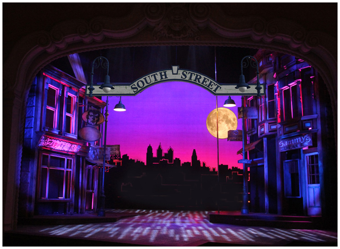 In the fall of 2011 I designed a brand new musical premiering at the famous Pasadena playhouse. the show takes place on Philadelphia's famous ' South Street ' when the action shifts from the street to the inside of one of the famous bars ( a converted fire house ) the street spins around on two turntables to reveal the forced perspective bar interior.